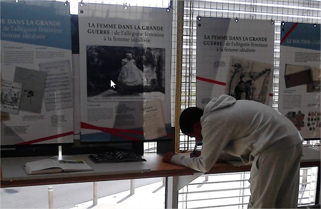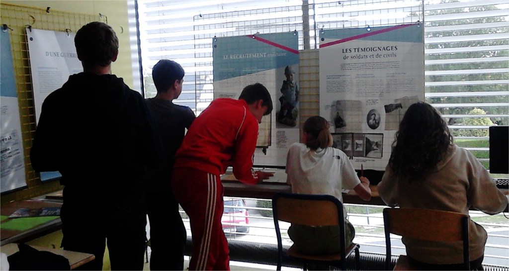 Catherine Dolghin, des Archives Départementales de Saint-Brieuc est venue à la rencontre des élèves de 3eme du collège pour présenter l’exposition sur la guerre 14-18. L’exposition présente une sélection issue des fonds documentaires des Archives de Saint Brieuc: coupures de presse, fiches matricules militaires, cartes postales anciennes mais aussi des objets et documents privés comme des photographies, des objets de l’artisanat de tranchées ou encore des effets personnels de soldats.