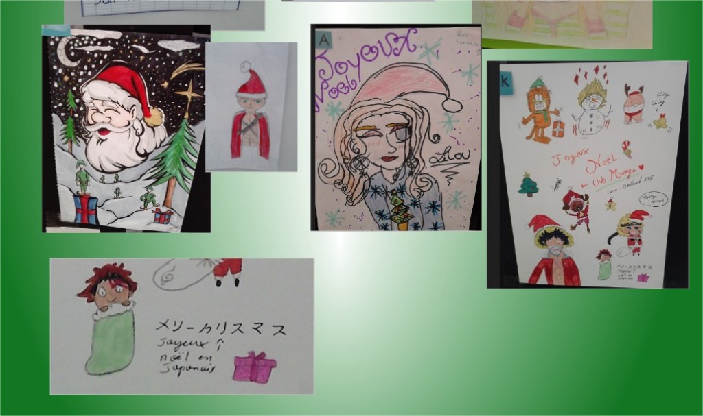 De nombreux dessins ont été crées pour cette fin d’année 2023. Beaucoup ont été affichés au foyer du collège. Le Club Manga se joint au concours de dessin organisé par la Vie scolaire (concours sur le thème de Noël) et vous présente une petite vidéo avec toutes les oeuvres d’élèves (dessins pour le concours de la Vie scolaire+ dessins du Club Manga).